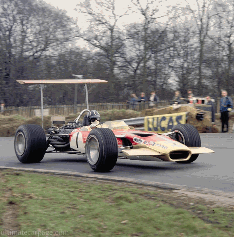 A month later, I was back in the Finger Lakes region of upstate New York. I still was unable to convince anyone to join me for the trip to the Glen so once again I drove my MGB into work on Friday morning and left for the Glen right after work. I was not all that upset about having to go alone because I planned to hook up with Bob and his dog, Brandy, when I got there. It would have been nice, though, to have someone to share the eleven-hour drive with me. When I got into the track that Saturday morning, October 5, 1968, I headed for the same area near Big Bend where I had stayed the last year. Sure enough, there was Brandy, fetching a ball thrown by Bob. I actually think that dog remembered me as she came running to me as soon as I called her. It was good to see them again. Recalling the kegs of Utica Club, I brought less of my own beer and gave Bob some money to cover a share of the kegs. He told me I did not need to do that, but it made me feel better. To the south of where we were camping there was a huge circus-like tent. Curious, I went to check it out. Inside the big tent were a bunch of smaller tents! They even had a campfire going in the middle of it all, so I walked over to find out what it was all about. Everyone in the group had pitched in to cover the cost of the big tent because they did not like camping in the rain. This way they could be outside their individual tents and still be out of the rain. The group called themselves the Fucowwees. Of course, I had to ask and they told me the name came from a lost Indian tribe. The chief of the lost tribe climbed a hill and looked around and in frustration called out, "Where the Fuc ow wee?" I was soon named an honorary member of the Fucowwee tribe. They had all come to the track in an old converted school bus. They had taken some seats out of the back to give them room to carry their camping gear plus the circus tent and other supplies, including a lot of beer. The Fucowwees would also have fit in at Road America. On top of the bus they had built a platform and they could climb up there to watch the on-track activities. One member of the group was a young woman with large breasts and an apparent love of beer from the way she was pounding them down. She was obviously feeling no pain and the beer buzz had apparently relaxed her inhibitions enough so that she was soon up on the platform on the bus flashing those big boobs repeatedly. When someone wandered near that she thought might not have had a look, she would shout out to get their attention and up came the shirt. Deciding that wasn’t enough, she decided to moon the crowd she had drawn. She dropped her shorts and panties and, bending at the waist, rotated a full 360 degrees to ensure every one got a good look. I mentioned to one of the Fucowwees that it seemed like she was having a good time. He smiled and said, "We call her Fanny the Flasher - for obvious reasons. She does that every race we go to." Having seen more than I needed of Fanny the Flasher, I retreated to Bob’s more subdued group and the keg of Utica Club. That Saturday evening, I had planned to drive into town and get another turkey dinner at the church, but I had heard about another place called the Seneca Lodge. Seneca Lodge was the Watkins Glen equivalent of Siebken’s in Elkhart Lake. It was located up in the hills west of the village and a couple of miles north of the track. Rumor had it that you could see drivers there and they had good food, so I decided to check it out. It was a rustic looking place and it was jam packed with race fans. The dining room was so crowded that I gave up on the idea of eating there but did manage to get a couple of beers at the bar. I looked around the place to see if there were any drivers there but did not see any - at least not any I recognized. It would have been awesome to see Graham Hill or Jackie Stewart relaxing over a pint in the bar. I finally gave up and left for town to get something to eat. The church was done serving turkey by that time so I hit a McDonalds for a big Mac and headed back to the track. That year, Colin Chapman was fielding three Lotus entries for Graham Hill, Mario Andretti and Jackie Oliver. The team was doing well despite the devastating loss of their leader, Jimmy Clark, earlier in the year. Hill came into the US GP tied with Denny Hulme at 33 points each for the championship. The Lotus cars were not in my favorite British Racing Green livery. The ban on sponsorship advertising on cars had been lifted and Team Lotus was now Gold Leaf Team Lotus and the cars were red and gold, the colors of Gold Leaf cigarettes. Another major change from 1967 was that many of the cars had sprouted wings and spoilers. The wings were funny looking as they sat high above the car about two feet above the driver’s head. They just did not look like a part of the car as they sat on two spindly looking supports. It was as though someone looked at the car after it was completed and said "Hey, I know, let’s put a wing on it!" I suspect they were put up so high to get them into clean air undisturbed by the airflow over the car’s body. In all fairness, teams were just now beginning to explore aerodynamics and the wings on each side of the nose on the Lotus 49B did not look bad. Lotus 49B The Ford Cosworth engine that had powered the Lotus comeback in 1967 was the dominant engine in Formula One in 1968. The power plant was now being used in eight of the twenty cars in the field, and wound up powering the winner in 11 of the year’s 12 events. Even Dan Gurney had given up on his unreliable Eagle Westlake V12 after the Italian Grand Prix, but McLaren had provided a McLaren M7A for him powered by the Ford Cosworth. This year there were three Americans entered in the race as Mario Andretti and Bobby Unser joined Dan Gurney. Unser’s record at Indianapolis is second to no one’s, but he was out of his element on the road course at the Glen where you actually have to shif