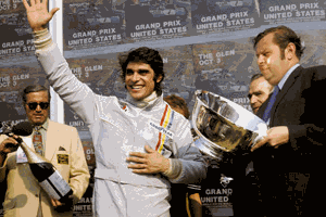 Running the Bog Finally, he apparently had had enough. He took the gas cap off his bike, spilled some gas, threw it on his bike and then, to my amazement, set it on fire! The crowd roared with delight at this. After that, whenever some hapless rider managed to fall in the muddy bottom of the depression, the crowd would yell, "If it doesn’t move, burn it!!" Thus was born the infamous Watkins Glen Bog. Word of the unexpected entertainment in the Bog soon spread, and all weekend long there was a crowd around it, chanting, "If it doesn’t move, burn it!" This continued unabated even when the cars were on the track, including during the race. Thankfully, race day brought cooler temperatures with it. Another scorcher like the day before might well have resulted in this being my last date with Liz. We decided to watch the race from the new grandstands in the Boot section. This gave us a great view of nearly all the new section. Although we could not see the Toe from there, it was close to where we were camped. Fortunately, Liz was suffering no ill effects from her fainting spell the day before, and the cooler weather did wonders for her mood. She seemed to be quite excited at the prospects of seeing her first Formula One race. In addition to beer, this time I packed the cooler with some Boone’s Farm Apple Wine. The theory was that by drinking wine instead of beer I would not have to go the john as often and thus would not miss as much of the race. Well, that was the theory anyway. I had taken a liking to Boone’s Farm Apple Wine and when others would shudder when I told them what I was drinking, I would tell them, "A big swig of Boone’s Farm Apple wine is just like taking a big bite out of a fresh apple!" I don’t think many believed me, though. We found a spot in the grandstands and settled in for the race. Jackie Stewart had taken all of the drama out of the championship this year by winning six races and had long since clinched his first world championship. I was pleased to see that there was a flock of American drivers entered - a total of five, in fact. Andretti was entered in a third Ferrari 312B2 for the famed Scuderia Ferrari. Mark Donahue, driving for Penske-White Racing, was in a McLaren M19A. I had seen Donahue drive at Road America several times and he was the great Roger Penske’s number one hired gun. Donahue was sharing the car with David Hobbs because he had to fly back and forth between the Glen and Trenton, where a delayed USAC race was taking place the same weekend. Andretti decided not to bother with the GP and opted for the USAC race, so only two Ferraris were in the race, driven by Clay Regazzoni and the venerable Jacky Ickx. Other Americans in the race were Skip Barber in a new March 711 with the strange looking oval shaped high front wing, Pete Lovely back again in an old Lotus 69, Sam Posey in a Surtees TS9 and Peter Revson, back after a seven year hiatus from F1. Revson was teamed with Stewart and Francois Cevert on the Elf Team Tyrrell driving a Tyrrell 001. Posey had to share his car with Gijs van Lennep with the fastest driver getting into the race. That turned out to be Posey. The grid was a bit different than I had seen before: three-car rows alternated with two-car rows. Jackie Stewart was on the pole, with Emerson Fittipaldi alongside him and Denny Hulme on the outside of the front row. Regazzoni, fastest of the Ferraris, was on the inside of the second row with Cevert alongside him. Andretti had posted a qualifying time that would have had him sixth on the grid, but both he and Donahue decided to honor other commitments and raced at Trenton. That left Posey as the highest qualifying American to start the race, well back in 17th position on the grid. Jacky Ickx in his Ferrari 312B I nearly missed the start, because I had to run to the john to get rid of some Boone’s Farm. Another theory shot down! We were all on our feet as the PA system announced the start, but we did not need loudspeakers to tell us the race had started. That incredible sound of Formula One engines easily reached us even at our more remote location. The excitement built when we heard the screaming engines grow louder as the cars headed into the carousel and then through the chute into our view. I was not surprised to see Stewart in the lead ahead of Hulme. Cevert had jumped up to third, followed by Regazzoni and Jo Siffert, who had started in Andretti’s forfeited 6th spot. I was surprised to see Fittipaldi all the way back in eighth, the victim of a poor start. March 711 Seven laps into the race, Cevert was able to get past Hulme for second, and after another seven laps, he moved past Stewart into the lead. Stewart was suffering from bad over-steer. Hulme was having handling problems as well and began to drop back, being overtaken by Ickx, who had passed Siffert. I missed this development because I was off to the john again. Stewart eventually fell victim to Ickx and then to Siffert’s BRM. Ickx stalked Cevert until lap 40 when he began to fall back as the result of a faulty alternator. This finally did him in and he retired on lap 49. This put Siffert into second place and Ronnie Peterson in the March 711 moved past Stewart into third. Howden Ganley, in the second BRM, also caught Stewart for fourth. Francois Cevert in the Tyrrell 002 Cevert led every lap from lap 14 on to win, followed by Siffert, Peterson, Ganley and Stewart, with Regazzoni taking the sixth and final point. My old favorite, Graham Hill, managed to soldier in with a seventh place finish. This was Cevert’s first Formula One victory and with the Mexican Grand Prix canceled, it was the last World Championship race of the season. Cevert collects his Trophy at the Glen After the race, we packed up my tent while we let traffic thin a bit. This did not help and the main roads were at a standstill. Using my best rally instincts, I struck off on the back roads and after what seemed like forever, finally made it to th