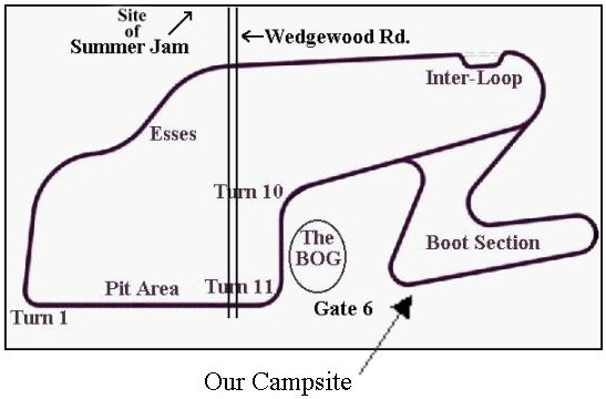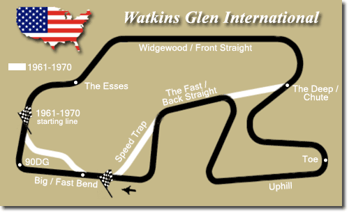 But Road America was not the host of the USGP so as the summer of 1971 came to an end, my thoughts turned once again towards making my usual trek to Watkins Glen. I was also going to have company again since by this time Liz and I were dating steady. Nearly every weekend, we were on a rally or off to a race. Since Liz had already been camping with me at Road America and Blackhawk Farms, she was more than willing to join me for a weekend at the Glen. She had quickly become a race fan and eagerly looked forwards to the trip. At last I had found a girlfriend who seemed to love racing as much as I did! As we made our plans, I recalled the freezing cold and snow we had the last year with Charlie and Jan, so I cautioned her to be sure to bring warm clothes. I was sure Liz would not care to drive all Friday night to get there so we decided to take both Friday and Monday off. Once again, I planned to camp on the outside of the track, which was less expensive. There were big changes at the Glen this year. A new section of track had been added on the southwest side of the track. After leaving the carousel, the new section of track ran through the woods, down a hill, and into a valley. At the bottom of the hill was a left hand corner that took the cars south again into another carousel type corner that swung them back to the north on the west side of the valley. After a brief straight, another tight right-hander ran them back down into the valley and up the hill to rejoin the old circuit. This new section was quickly dubbed the "Boot," with the carousel at the south end being named the "Toe". Big Bend was also no more. The entrance to this old section was now squared off by a couple of tight turns, and where Big Bend had been was now the new front straight with the new start/finish and pit lane. The pit lane was lined with small garages for the teams and had some reserved grandstand seating on the roof, which provided an excellent view of the teams in the pit lane. The new track layout When Liz and I arrived on Friday night Oct 1, 1971, I decided to camp near the new "Boot" section. We drove down the west access road and found a campsite across the access road from the new grandstands at the north end of the uphill section of the track in the heel of the boot. We set up camp, I fired up the grill and we had some dinner, and then visited with a few of our neighbors who had already had a chance to explore the new section of the track. After talking to them, I could not wait to check it out for myself the next day. But since we could not see much in the dark, wait I did. Saturday morning, we exited the tent into a bright sunny day, proving once again that you can never know what kind of weather you are going to get in the Finger Lakes region in October. It was quite warm, and as the sun rose in the sky, so did the temperature. By noon, it was downright hot!! It was a far cry from the freezing weather and snow Charlie and Jan and I had endured the previous year. Liz had heeded my sage advice and brought plenty of warm clothing. In fact, all she had was warm sweaters and such. I was better prepared, having also brought along tee shirts and shorts. By now, I had spent many weekends working corners at Midwestern Council races and remembered Carl’s corollary "If you didn’t bring it with you, you can’t put it on." I had soon learned that this was good advice; however, it seems I had neglected to pass that wisdom on to Liz. By the time I had stocked a small cooler with beer and ice and we set off to check out the new section of track, the poor girl was suffering. The temperatures had to be in the nineties and soon even I, in my lighter clothing, was sweating as we passed through a tunnel to the inside of the track. Deciding it would be best to watch the practice session from the shade, I led Liz through the valley and up the hill into the woods where we could watch the cars enter the new section. We were not the only ones who had this I idea, and by the time we got to the location I had picked out, the crowd was five deep at the fence. I have to admit it was hot - it was equatorially hot!! I wisely decided to remain in the shade of the woods despite the crowd along the fence. The heat sure did make the cold beer taste good though. The F1 cars came out for practice and I was excited enough to forget about the heat. The crowd was fluid, and soon those next to the fence would leave to find a new venue and those behind them would move up and take their place. I waited impatiently for enough people to move so that Liz and I could get next to the fence for a better view. Finally, it was our turn and we moved up next to the fence. I looked up the track and the first car I saw coming was my old favorite, Graham Hill, this year driving a Brabham-Cosworth BT34. I had told Liz all about Hill, his two world championships, the bad crash at the Glen two years before, and his blue helmet with the white stripes of the London Rowing Club. I pointed at him excitedly and said, "Look, here comes Graham Hill!" I turned to look at Liz, but she was not standing there beside me as I expected. To my horror, I saw her stretched out on the ground, flat on her back and out like a light! Another spectator helped me move her away from the fence, deeper into the shade. I grabbed some ice from the cooler and applied it to her forehead, and to my relief she came to almost instantly. The ninety degree-plus temperatures, and the fact she only had sweaters and jeans to wear, had finally gotten to her, and she had fainted from the heat. I helped her sit up, gave her some more ice, and fanned her with the cooler lid. Someone asked if they should go get an ambulance, but Liz said no, she would be fine. Of course, we lost our long awaited spot at the fence. That had filled in the instant we moved Liz deeper into the shade. We took it very easy the rest of that day, and stayed in the shade as much as we possibly could. When we got back to our