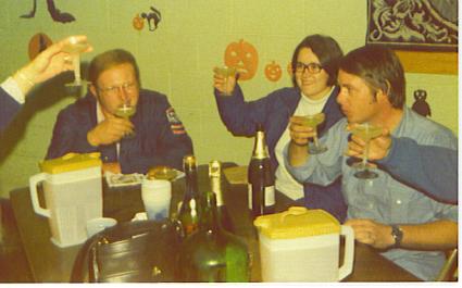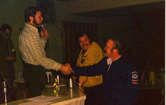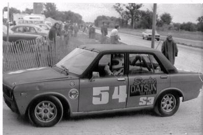 Driven by the need for more speed, I suppose, Bunky had given up running his Showroom stock 240 Z in CP. The only time he drove it in competition was the race after our drivers’ school. Like me, he knew he wanted to go racing and acquired a D Production Triumph TR-4 soon after the driver’s school weekend. Bunky did quite well in the Triumph and won the Midwestern Council DP championship in 1973. I brought a few bottles of champagne along the first weekend we suspected Bunky would clinch the championship. But he didn’t and I wound up having to take it home again. The second time I brought the champagne along not only did Bunky clinch the championship, he won the race. Bunky receives his trophy from Denny as Big Al looks on I brought the champagne into the Mechanic’s Lodge where the post race trophy presentation/beer bash was being held. As Bunky was called to the front by Denny to collect his first place trophy, which clinched the class championship, we all cheered. As he returned to our table, we popped the corks on the champagne bottles and poured out the bubbly. This was a historic moment since one of our own was truly a champion! This was one of the few times we held off on the free beer offered by the host club and toasted Bunky’s championship with the champagne. But once the champagne was gone, we switched to the free beer. Bunky, Liz and Mike as we toast his DP Championship There are two occasions from that season that I remember well. The first was the night Jimmy and I went out to Dixon to help Bunky get ready for the first race of the season. Bunky kept the car in a shed on his parent’s farm. Over the winter, some mice decided that the Triumph with the number 55 on it looked like a nice place to live. The first order of business was to evict the mice. As usual, we ran into problems, and things were taking a lot longer than we expected. I worked on changing brake shoes and adjusting the brakes while Bunky and Jimmy worked on the engine. Finally, around three in the morning, I went into the house to get some sleep because I planned to work corners the next morning. Bunky and Jimmy said they could finish up and continued to work on. I got up around 6:30. Bunky’s mom was up, as she usually was by that time, and working in the kitchen. His father was already out doing chores in the barn. Bunky’s mom told me that Bunky and Jimmy had finished working on the car and were sleeping. She offered to make me some breakfast, which I regretfully declined. I thanked her for putting me up for the night, said good-by and headed for Blackhawk and the worker’s meeting. I was assigned to work as Captain in corner seven and headed out to my station. The morning practices were quite eventful and I had a lot of action in my corner. I was somewhat surprised when the group including DP came out and Bunky was missing. I figured they had not quite finished the car and were late because of that. I really got suspicious when the DP group came out for their second practice a few hours later, and still no number 55 in the field. Now I was worried something might have happened to them. After all, we had thrashed on the car all night just so Bunky could race that day and he was still missing. Something was wrong. The first race of the day was for Formula Vee. The field was still closely packed when they came into corner seven on the first lap. As I watched them come into the corner, I saw a nosecone fly up into the air. I could plainly see the number on it and recognized it as belonging to my buddy, Don. He had bumped the rear tire of the car ahead of him under braking and it tore the car’s nose off and threw it into the air. I watched it flipping in the air as the field passed beneath it. I was positive it would come down right over some unsuspecting Vee driver’s head. Fortunately, it landed just off to the side of the track. The pace lap for the DP group came by and I eagerly looked for Bunky’s number 55 at the back of the pack where he would have to start after missing both practices. He was not there. Now I was really worried. It was not like Bunky to miss a chance to race. When I got home that night, I called him to find out what had happened to them. I was somewhat relieved when he answered the phone. I asked him what had gone wrong with the car. "Nothing," he said, "we just decided we were too tired to go." That was the last time I would spend most of the night working on any of Bunky’s cars! Bunky won a few races that year, but I was usually out working on a corner so Jimmy who always crewed for him would ride with him on his victory lap. That was the year when I was Race Chairman for the Grattan race. I decided my duties would allow me enough time to crew for Bunky along with Jimmy. Bunky managed to win his race, even with my help. Jimmy and I piled into the car for the traditional victory lap. Well, Jimmy piled in and I jumped on. There was no passenger seat in the car, but Jimmy, who was now an experienced victory lap rider, climbed into where it would have been and sat on the floor. I sat on the back of the car and was holding on to the roll bar. As we started out, I was waving the checkered flag they gave us. I soon stopped waving the flag and was hanging on to the roll bar for dear life. Bunky apparently thought the race was still on and he was screaming around the track. I was just screaming. When we came in from our victory lap, I nearly had to have someone help pry my hands off the roll bar. The chief steward came over and gave Bunky a butt-chewing about reckless driving on the pace lap. At the next Council contest board meeting, they passed a new rule banning multi-person riders on victory laps. After that, victory laps were limited to only one person in addition to the driver and that person had to be in the car - not on it as I had been. After my harrowing ride, I thought this was a sensible rule. At that race, Jimmy and I also agreed to crew for Mayday Mary, who was