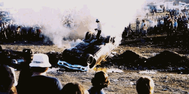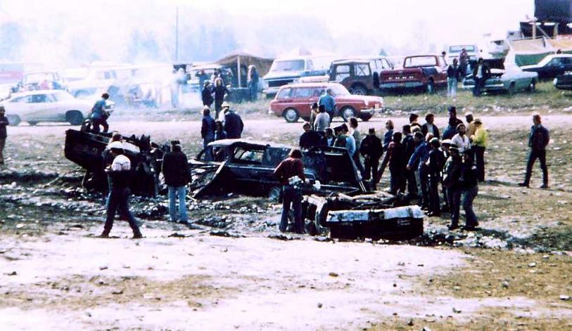 Dancing in the flames After a short while, I heard a guy yell, "There’s a Mustang! Lets burn a Mustang!" after which he threw a rock the size of a baseball at a nearby Mustang. The rest of the mob took up the cheer, "Let’s burn a Mustang!" and began pelting the car with rocks, breaking windows and denting it up pretty well. Then a bunch of them rolled the Mustang over on its roof and set fire to it. Not content to steal a car and drive it to the Bog, the mob must have decided it would just be more efficient to burn the cars where they were. I looked around, but did not see any track security or police anywhere. They must have known what was going on, but chose to ignore it. Now I was even happier with our decision to camp inside the track, away from this madness. As I watched, they attacked another car. "There’s a Pinto! Let’s burn a Pinto!" Once they had that ablaze, they turned their attention to a bigger target. "There’s a Winnebago! Lets burn a Winnebago!" someone shouted and bounced a rock off the side of the motor home. At that, the door to the Winnebago flew open, a man stepped out and fired a shotgun into the air. That got the mob’s attention, and in the quiet that followed, I heard the man shout, "One more rock hits this motor home and I empty the gun into the crowd and I do not care how many of you F___ers I kill!" The mob remained silent for a few seconds, then someone shouted, "There’s a Camaro! Let's burn a Camaro!" and off they went, away from the Winnebago. If nothing else, the mob was flexible. I shook my head in disbelief at what I had just seen and headed back to the safety of the inside of the track and our tent. The next morning, I did see some security people patrolling the area around the Bog. There were only a few of them, but they were equipped with helmets and nightsticks. They looked like they meant business, but it did not seem to help. The mob would just go to where there were no security guards and burn another car. It appeared to me to be too little, too late. I felt sorry for all of those who had fallen victim to the mob and lost their cars.