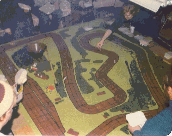 During the winter of 1974-75, I decided to sanction a racing event of my own. I called it the "24 Hours of Bensenville" and planned to hold it in my garage. Well, actually it was going to be a board game based on the game "Speed Circuit" which was produced by Avalon and which Liz had given to me. The game board had the outlines of two racetracks. Monte Carlo on was on one side and Le Mans on the other. The circuits were divided into 4 lanes and each lane was divided into spaces formed by rectangles. It was in the corners that the game got interesting. If you went around the corner on the inside lane there were fewer spaces, so you got through more quickly than the outer lanes. The farther out the lane, the more spaces it took to go around the corner. Each space in the corners had a posted speed limit. The inside lanes had lower speed limits than the outside lanes. The speed limits were adjusted so that it took the same amount of time to go around the shorter inside lane as it did the longer outside lane. To gain the advantage of the shorter route, you had to exceed the posted speed limit. The catch was that you had to pay a penalty to exceed the posted speed limit. Before the race began, each contestant would have to "design" their car. They could specify the top speed of the car, how fast it could accelerate to that speed and how quickly it could slow down. For acceleration, the "designer" would indicate in increments of 10 mph how many spaces it would take to get to top speed. For example, a car with an acceleration factor of 40 mph per space could reach 200 mph in 5 spaces. If the car also had a braking factor of 40 mph per space, it could slow down from 200 mph to 80 in three spaces. Based on the design of your car, you were awarded so many "wear units" per lap. The higher the top speed and the greater the acceleration and braking, the fewer wear units the car was awarded. For every 10 mph you exceeded the posted speed limit in a space, you were penalized one wear unit. If you were penalized more that the allotted wear units on a lap, you were out of the race just as if you had a real mechanical failure. Each time you completed a lap, you were awarded a new set of wear units. Before each corner, each contestant would write down the speed they wanted to move on that corner. You could move one space for every 10 mph, so if you designed a car with a top speed of 180 mph, you could move 18 spaces once you had accelerated to top speed. You had to plan ahead for the corners to be sure you could slow down to the speed you wanted to use for the line you wanted to use, knowing you had to conserve enough wear units in the corners to be able to complete the lap. Of course, there was always a chance that another car would be blocking your preferred line, which would cause you to change your line. If you altered your line to the outside, it would take more spaces to get through the corner, but fewer wear units. If you were forced inside of the corner, you would lose more wear units than you had planned for that corner. The game would be played for a set number of laps, and whoever completed the laps first won the game. It was really a simple game, but it had caught on with some of my friends in the Chicagoland Sports Car Club, like Jerry and Judy. We would invite them over for dinner and afterwards, we would play Speed Circuit for a couple of hours. While I enjoyed the game, I felt that I could improve on it. First, I decided it would be more fun to play it on circuits we were familiar with, such as Road America and Blackhawk. Denny, the GT-6 driver who had given me my shower during the flood in corner five, also enjoyed the game, and when I suggest we make up our own tracks, he said he would take care of it. Denny was an architect by profession, and in no time at all, he had both Road America and Blackhawk laid out on sheets of acetate. This greatly improved our enjoyment of the game. I also had Denny include pit lanes on the circuits he drew up, and introduced pit stops to the game. If you exceeded your allotted wear units on a lap, you could limp back to the pit lane at a reduced speed and stop in the pits for one turn. This allowed you to repair your car and receive a full set of wear units so that you could rejoin the race instead of being out of the game. To hold my "24 Hours of Bensenville," I needed something bigger than the sheets of acetate we laid down on the dining room table to play the game. Denny again came through by drawing a layout of Road America on two 4 X 8 foot sheets of dry wall. These we supported on a couple sheets of plywood and some sawhorses in the middle of my garage. Denny really outdid himself with this layout by painting in trees and many of the buildings that actually were located on the track, like the pagoda, the timing and scoring building and even some of the concession stands. In one of the vendor’s booths at Road America, I found a bunch of small formula cars the size of Hot Wheels cars. I bought a bunch of these to use for the 24 hours. I even purchased some Hot Wheels emergency vehicles, including an ambulance, a fire truck and a wrecker, which I parked on the board near the start finish line. I also put some rubber tips on a couple of three-foot long wooden dowels. These made it easier to move the cars in the middle of the board. Since the game would take so long, I decided to add a couple more factors to the game, including fuel consumption and weather. Entrants would be assigned a fuel consumption factor based on the acceleration and top speeds they chose to design their car. The faster the car, the more fuel it burned, and the more frequently it would have to stop in the pit lane to refuel. For the weather, I had 48 sealed envelopes. Every half hour during the race, I would open an envelope and read the current weather conditions. I modified the rules so that if it was raining, all the cars’ performance factors would be greatly reduced. Teams could